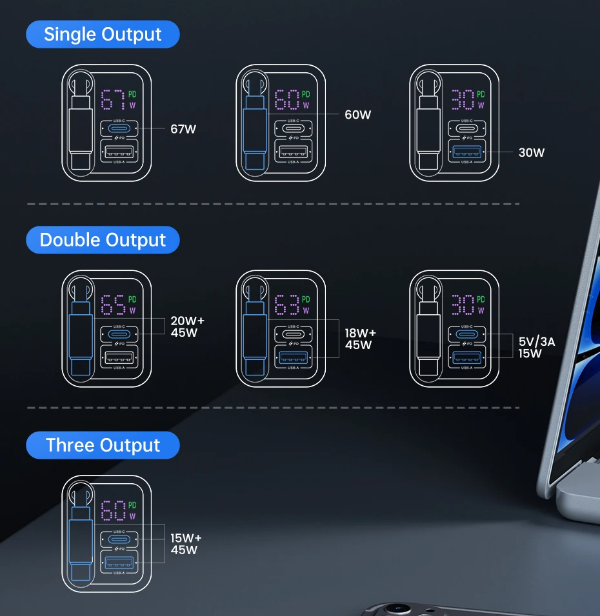 - 3-in-1 충전기 디자인:Toocki 충전기는 USB-C, USB-A 포트와 타입-C 케이블을 갖추고 있어 다양한 기기를 동시에 충전할 수 있습니다.