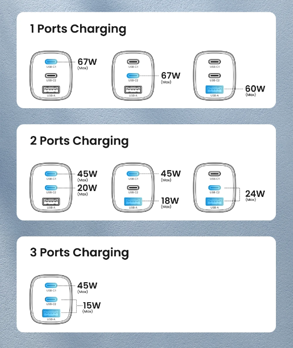 - PPS 프로토콜이 없는 USB-C1은 삼성 고속 충전을 지원하지만 삼성 초고속 충전은 지원하지 않습니다. C1 포트는 노트북 PD-65W/67W 고속 충전에 적합합니다. 삼성 휴대폰을 초고속 충전으로 충전해야 하는 경우 C2 포트를 사용하세요.